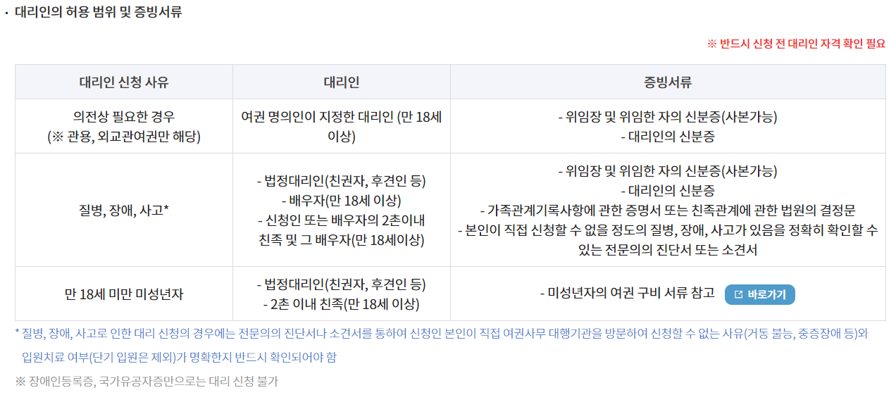 미성년자 여권 발급시 대리인의 신청 (법정대리인, 2촌이내 친족)